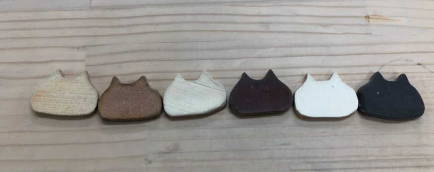 素焼きの様子です。左から白粘土・赤粘土・白水ヒ粘土・赤水ヒ粘土・白信楽粘土・黒泥粘土になります。