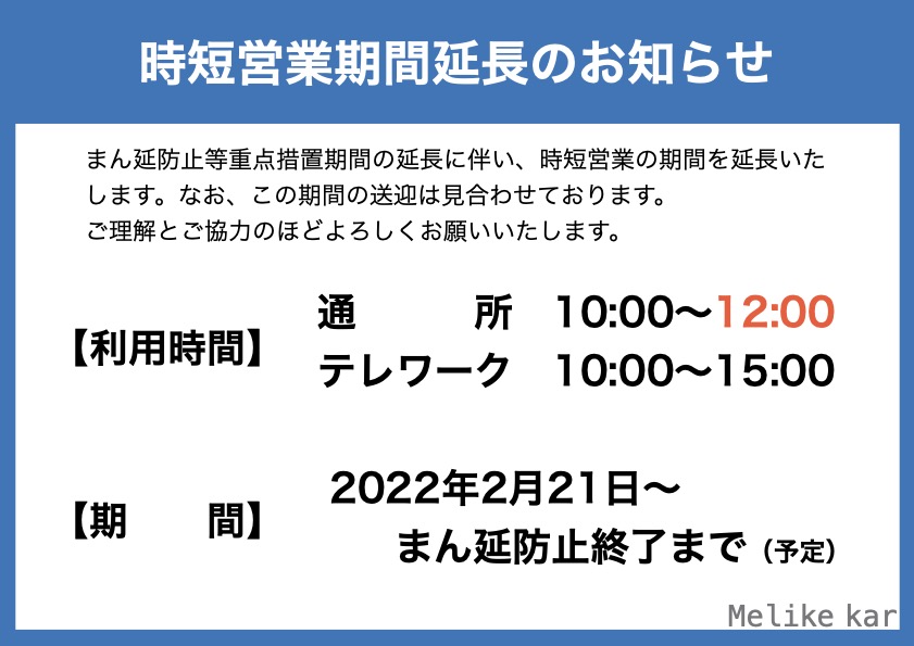 新型コロナ感染症対策に係るまん延防止等重点措置期間の延長に伴い、当事業所の時短営業期間を延長することとなりましたのでお知らせいたします。