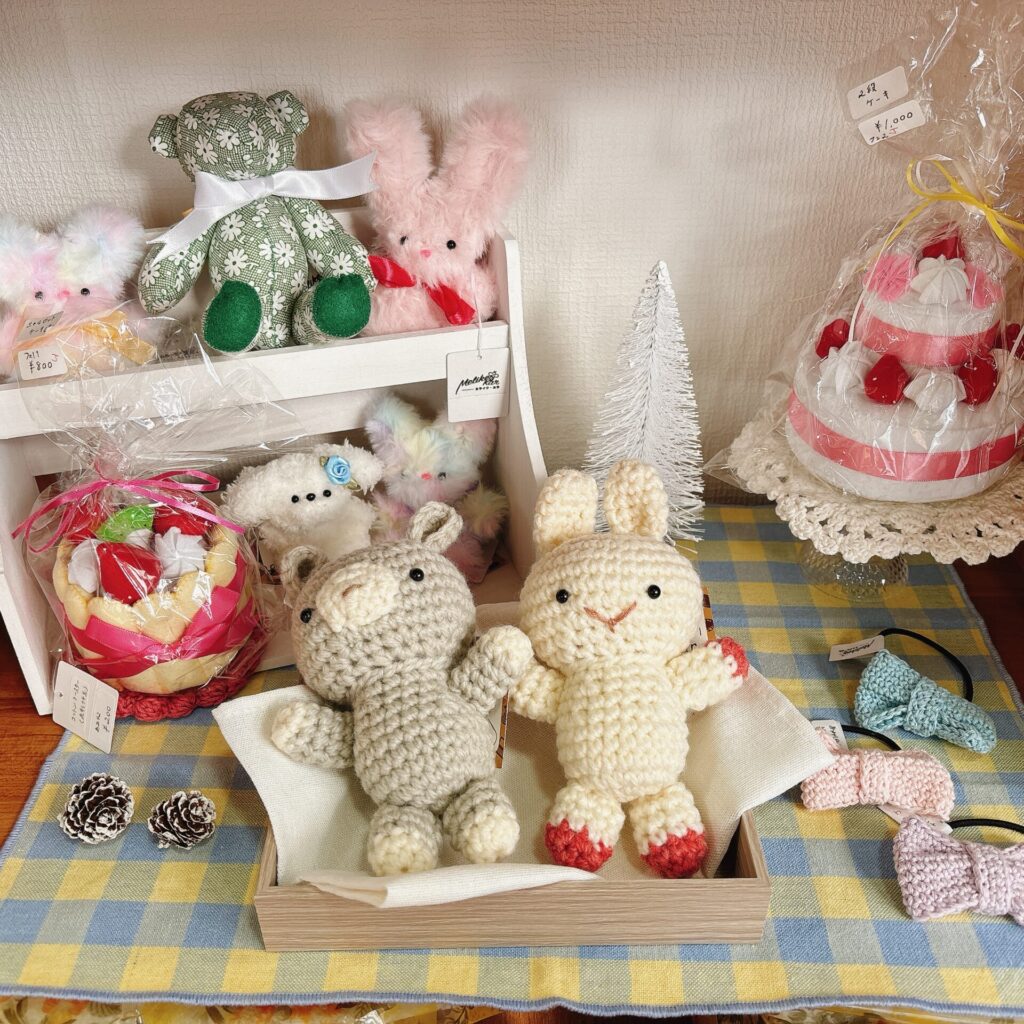 雑貨制作からは編みぐるみやフェルトで出来たケーキ、クリスマスカラーの巾着やブローチなど🎄